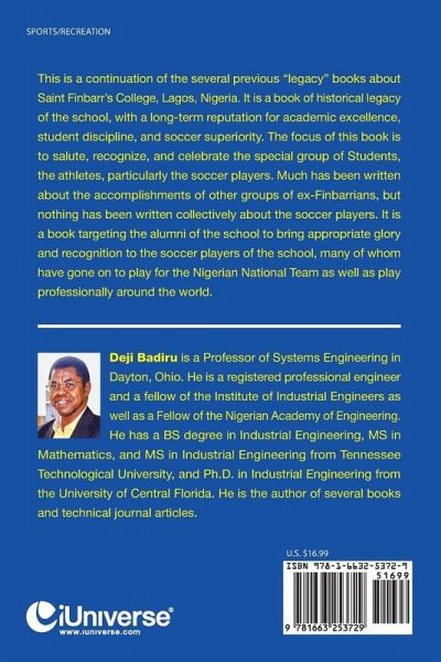 This is a continuation of the several previous "legacy" books about Saint Finbarr's College, Lagos, Nigeria. It is a book of historical legacy of the school, with a long-term reputation for academic excellence, student discipline, and soccer superiority. The focus of this book is to salute, recognize, and celebrate the special group of Students, the athletes, particularly the soccer players. Much has been written about the accomplishments of other groups of ex-Finbarrians, but nothing has been written collectively about the soccer players. It is a book targeting the alumni of the school to bring appropriate glory and recognition to the soccer players of the school, many of whom have gone on to play for the Nigerian National Team as well as play professionally around the world.