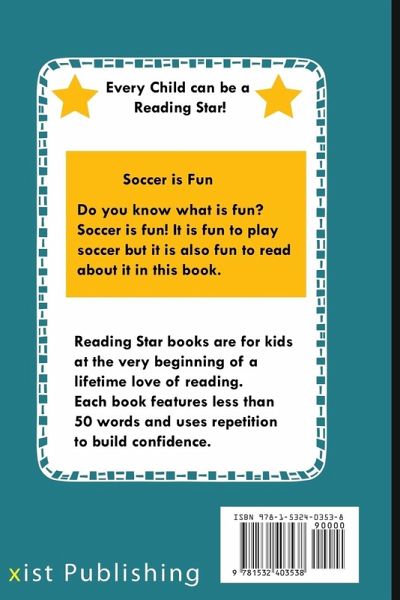 Bilingual Reading Stars Beginning Reader Do you know what is fun? Soccer is fun! It is fun to play soccer but it is also fun to read about it in this book. Reading Star books are for kids at the very beginning of a lifetime love of reading. Each book features less than 50 words and uses repetition to build confidence. Lector principiante ¿Sabes lo que es divertido? ¡El fútbol es divertido! Es divertido jugar al fútbol, ¿¿pero también es divertido leerlo en este libro. Los libros de Reading Star son para los niños en el principio de su vida amorosa por la lectura. Cada libro cuenta con menos de 50 palabras y utiliza la repetición para crear confianza.