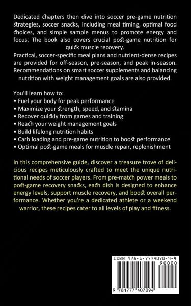 Dedicated chapters then dive into soccer pre-game nutrition strategies, soccer snacks, including meal timing, optimal food choices, and simple sample menus to promote energy and focus. The book also covers crucial post-game nutrition for quick muscle recovery. Practical, soccer-specific meal plans and nutrient-dense recipes are provided for off-season, pre-season, and peak in-season. Recommendations on smart soccer supplements and balancing nutrition with weight management goals are also provided. You'll learn how to:Fuel your body for peak performance Maximize your strength, speed, and stamina Recover quickly from games and training Reach your weight management goals Build lifelong nutrition habits Carb loading and pre-game nutrition to boost performance Optimal post-game meals for muscle repair, replenishment In this comprehensive guide, discover a treasure trove of delicious recipes meticulously crafted to meet the unique nutritional needs of soccer players. From pre-match power meals to post-game recovery snacks, each dish is designed to enhance energy levels, support muscle recovery, and boost overall performance. Whether you're a dedicated athlete or a weekend warrior, these recipes cater to all levels of play and fitness.