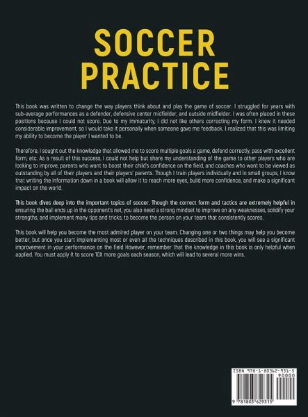 This book was written to change the way players think about and play the game of soccer. I struggled for years with sub-average performances as a defender, defensive center midfielder, and outside midfielder. I was often placed in these positions because I could not score. Due to my immaturity, I did not like others correcting my form. I knew it needed considerable improvement, so I would take it personally when someone gave me feedback. I realized that this was limiting my ability to become the player I wanted to be. Therefore, I sought out the knowledge that allowed me to score multiple goals a game, defend correctly, pass with excellent form, etc. As a result of this success, I could not help but share my understanding of the game to other players who are looking to improve, parents who want to boost their child's confidence on the field, and coaches who want to be viewed as outstanding by all of their players and their players' parents. Though I train players individually and in small groups, I know that writing the information down in a book will allow it to reach more eyes, build more confidence, and make a significant impact on the world. This book dives deep into the important topics of soccer. Though the correct form and tactics are extremely helpful in ensuring the ball ends up in the opponent's net, you also need a strong mindset to improve on any weaknesses, solidify your strengths, and implement many tips and tricks, to become the person on your team that consistently scores.This book will help you become the most admired player on your team. Changing one or two things may help you become better, but once you start implementing most or even all the techniques described in this book, you will see a significant improvement in your performance on the field However, remember that the knowledge in this book is only helpful when applied. You must apply it to score 10X more goals each season, which will lead to several more wins.