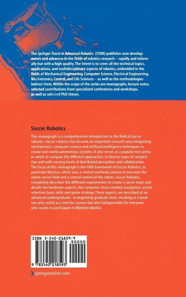 This monograph is a comprehensive introduction to the field of soccer robotics. Soccer robotics has become an important research area integrating mechatronics, computer science and artificial intelligence techniques to create real-world autonomous systems. It also serves as a popular test arena in which to compare the different approaches, in diverse types of competition and with varying levels of distributed perception and collaboration. The focus of this monograph is the FIRA framework of Soccer Robotics, in particular MiroSot, which uses a central overhead camera to overview the whole soccer field and a central control of the robots. "Soccer Robotics" completely describes the different requirements to create a soccer team and details the hardware aspects, the computer vision needed, navigation, action selection, basic skills and game strategy. These aspects are described at an undergraduate level, resulting in a book not only useful as a text for courses but also indispensable for everyone who wants to participate in MiroSot robotics.