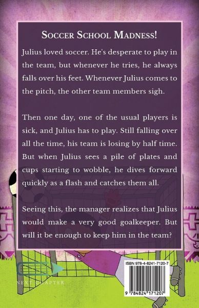 Julius loved soccer. He's desperate to play in the team, but whenever he tries, he always falls over his feet. Whenever Julius comes to the pitch, the other team members sigh. Then one day, one of the usual players is sick, and Julius has to play. Still falling over all the time, his team is losing by half time. But when Julius sees a pile of plates and cups starting to wobble, he dives forward quickly as a flash and catches them all. Seeing this, the manager realizes that Julius would make a very good goalkeeper. But will it be enough to keep him in the team?