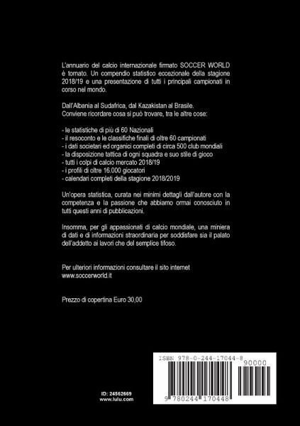 L?annuario del calcio internazionale firmato SOCCER WORLD ? tornato. Un compendio statistico eccezionale della stagione 2018/19 e una presentazione di tutti i principali campionati in corso nel mondo. Dall?Albania al Sudafrica, dal Kazakistan al Brasile. Questo volume contiene: - le statistiche di pi? di 60 Nazionali - il resoconto e le classifiche finali di oltre 60 campionati - i dati societari ed organici completi di circa 500 club mondiali - la disposizione tattica di ogni squadra e suo stile di gioco - tutti i colpi di calcio mercato 2018/19 - i profili di oltre 16.000 giocatori - calendari completi della stagione 2018/2019 Un?opera statistica, curata nei minimi dettagli dall?autore con la competenza e la passione che abbiamo ormai conosciuto in tutti questi anni di pubblicazioni. Insomma, per gli appassionati di calcio mondiale, una miniera di dati e di informazioni straordinaria per soddisfare sia il palato dell?addetto ai lavori che del semplice tifoso.