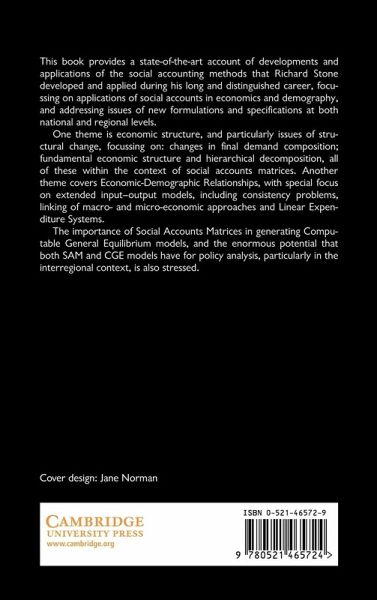 This book provides a state-of-the-art account of developments and applications of the social accounting methods that Richard Stone developed and applied during his long and distinguished career, focussing on applications of social accounts in economics and demography, and addressing issues of new formulations and specifications at both national and regional levels. One theme is economic structure, and particularly issues of structural change, focussing on: changes in final demand composition; fundamental economic structure and hierarchical decomposition, all of these within the context of social accounts matrices. Another theme covers Economic-Demographic Relationships, with special focus on extended input-output models, including consistency problems, linking of macro- and micro-economic approaches and Linear Expenditure Systems. The importance of Social Accounts Matrices in generating Computable General Equilibrium models, and the enormous potential that both SAM and CGE models have for policy analysis, particularly in the interregional context, is also stressed.