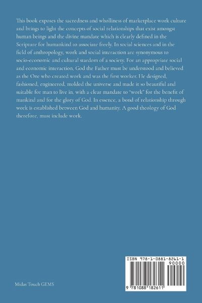 This book exposes the sacredness and wholliness of marketplace work culture and brings to light the concepts of social relationships that exist amongst human beings and the divine mandate which is clearly defined in the Scripture for humankind to associate freely. In social sciences and in the field of anthropology, work and social interaction are synonymous to socio-economic and cultural stardom of a society. For an appropriate social and economic interaction, God the Father must be understood and believed as the One who created work and was the first worker. He designed, fashioned, engineered, molded the universe and made it so beautiful and suitable for man to live in, with a clear mandate to "work" for the benefit of mankind and for the glory of God. In essence, a bond of relationship through work is established between God and humanity. A good theology of God therefore, must include work.