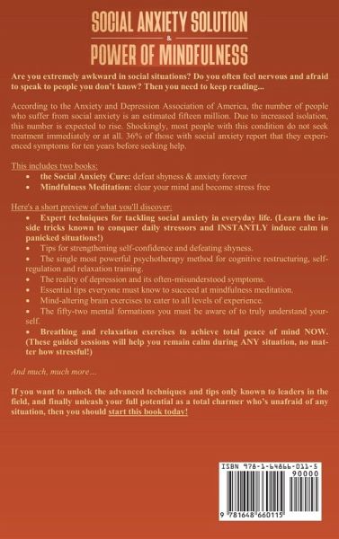 Are you extremely awkward in social situations? Do you often feel nervous and afraid to speak to people you don’t know? Then you need to keep reading... According to the Anxiety and Depression Association of America, the number of people who suffer from social anxiety is an estimated fifteen million. Due to increased isolation, this number is expected to rise. Shockingly, most people with this condition do not seek treatment immediately or at all. 36% of those with social anxiety report that they experienced symptoms for ten years before seeking help. This includes two books: The Social Anxiety Cure: defeat shyness & anxiety forever Mindfulness Meditation: clear your mind and become stress free Here's a short preview of what you'll discover: Expert techniques for tackling social anxiety in everyday life. (Learn the inside tricks known to conquer daily stressors and INSTANTLY induce calm in panicked situations!) Tips for strengthening self-confidence and defeating shyness. The single most powerful psychotherapy method for cognitive restructuring, self-regulation and relaxation training. The reality of depression and its often-misunderstood symptoms. Essential tips everyone must know to succeed at mindfulness meditation. Mind-altering brain exercises to cater to all levels of experience. The fifty-two mental formations you must be aware of to truly understand yourself. Breathing and relaxation exercises to achieve total peace of mind NOW. (These guided sessions will help you remain calm during ANY situation, no matter how stressful!) And much, much more… If you want to unlock the advanced techniques and tips only known to leaders in the field, and finally unleash your full potential as a total charmer who’s unafraid of any situation, then you should start this book today!