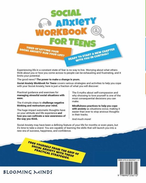 Tired of allowing your social anxiety to control your life? Do you find it hard to comprehend your teenager's social life struggles? Are you a professional looking for an engaging, cutting-edge tool to help your adolescent customers with their social anxiety? Life as a teenager isn't easy. Not only are you expected to keep up with your grades, extracurriculars, and social life, but you're also facing many decisions that will shape and define your future. Keep reading... Anyone would feel pressured, but the burden can become overwhelming for millions of teenagers who suffer from social anxiety. Adolescence is the time to explore the options and discover what makes you, YOU. But when you're held back by fear, you miss out on these opportunities while feeling trapped and helpless. Experiencing life in a constant state of fear is no way to live. Worrying about what others think about you or how you come across to people traps you within yourself and limits your potential. The good news? The power to make a change is yours. Discover the huge impact your mind has on overcoming challenges, handling failure, and rising to the occasion armed with the evidence-based practices, strategies, and exercises detailed in this workbook. Learn how to harness the mental strength in dozens of situations that often strike dread into the hearts of teenagers everywhere: presentations, conflicts, parties, and more... The Social Anxiety Workbook for Teens is the most easy-to-read, entertaining, and engaging toolbox with valuable supportive material and strategies combined with 5- to 10-minute quick-write activities, affirmations, checklists, and work- sheets. Here is just a fraction of what's hidden inside the workbook:Proven activities and tools to help you manage stressful social situations with ease. How the complex interactions between thoughts, feelings, and behavior can be used to manage anxiety and stress through practice. 4 simple steps to challenge negative thinking and restructure your mind. Self-assessments for identifying areas you struggle with so you can work on what's most important to you. The huge impact automatic thoughts have on your attitude and life experience and how you can cultivate a new awareness of the way you think. Why certain situations trigger feelings of dread and overwhelm and what you can do about it. 5 myths about self-compassion and why choosing to love yourself is one of the most influential decisions you can make. Mindfulness practices to help you cope with anxiety as situations occur, making it easier than ever to stop anxious thoughts in their tracks. And much more! If you want to understand social anxiety better, whether you are a teen trying to acquire social anxiety management skills on your own or working with therapists who want to augment what you learned in sessions, this toolbox is for you. Whether you are a parent/guardian raising a teen looking for solutions to help them or perhaps a therapist seeking materials that teenagers will truly enjoy utilizing, don't look any further.Social anxiety may have been a defining feature of your life for months or even years, but now is the time to take a stand.Ready to learn the skills to master the most effective coping mechanisms in order to regain control and truly relish life? Then stop searching and scroll up to get your copy right away.