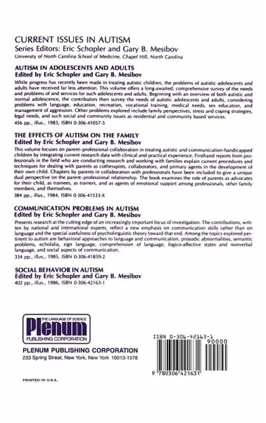 An important component of Division TEACCH's mandate from the Department of Psychiatry of the University of North Carolina School of Medicine and the North Carolina State Legislature is to conduct research aimed toward improving the understanding of developmental disabilities such as autism and to train the professionals who will be needed to work with this challenging population. An important mechanism to help meet these goals is our annual conference on topics of special importance for the understanding and treatment of autism and related disorders. As with the preceding books in this series entitled Current Issues in Autism, this most recent volume is based on one of these conferences. The books are not, however, simply published proceedings of conference papers. Instead, cer tain conference participants were asked to develop chapters around their pres entations, and other national and intemational experts whose work is beyond the scope of the conference but related to the conference theme were asked to contribute manuscripts as weil. These volumes are intended to provide the most current knowledge and professional practice available to us at this time.