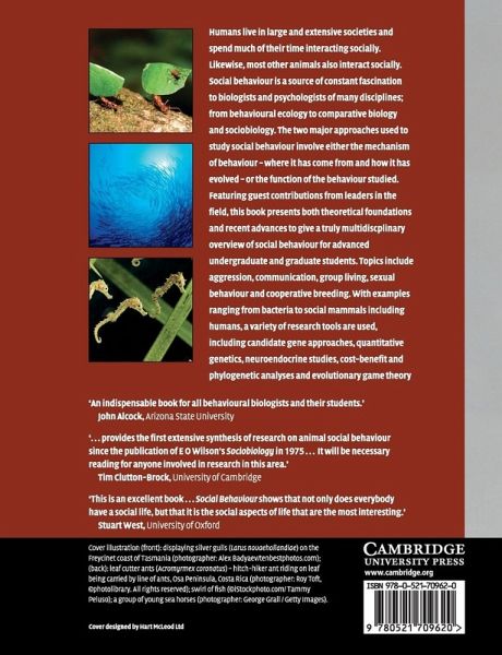 Humans live in large and extensive societies and spend much of their time interacting socially. Likewise, most other animals also interact socially. Social behaviour is of constant fascination to biologists and psychologists of many disciplines, from behavioural ecology to comparative biology and sociobiology. The two major approaches used to study social behaviour involve either the mechanism of behaviour - where it has come from and how it has evolved, or the function of the behaviour studied. With guest articles from leaders in the field, theoretical foundations along with recent advances are presented to give a truly multidisciplinary overview of social behaviour, for advanced undergraduate and graduate students. Topics include aggression, communication, group living, sexual behaviour and co-operative breeding. With examples ranging from bacteria to social mammals and humans, a variety of research tools are used, including candidate gene approaches, quantitative genetics, neuro-endocrine studies, cost-benefit and phylogenetic analyses and evolutionary game theory.