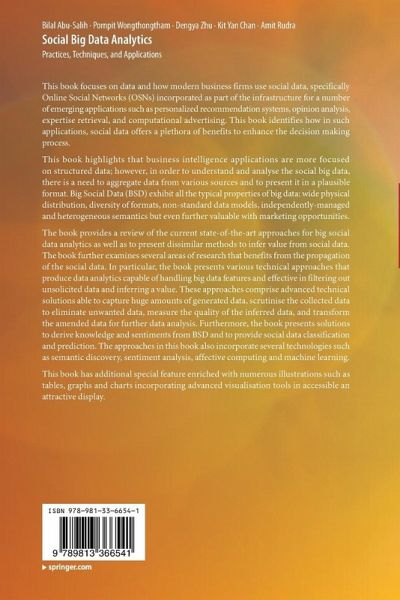 This book highlights that business intelligence applications are more focused on structured data; however, in order to understand and analyse the social big data, there is a need to aggregate data from various sources and to present it in a plausible format. Big Social Data (BSD) exhibit all the typical properties of big data: wide physical distribution, diversity of formats, non-standard data models, independently-managed and heterogeneous semantics but even further valuable with marketing opportunities.