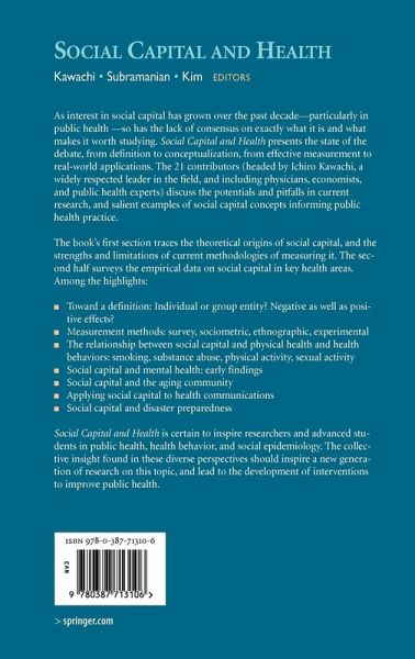 "The book consists of an introduction plus two large sections, the first on the measurement of social capital and the second on the evidence linking social capital to health. ... This book will be a useful reference for anyone interested in understanding and studying the many and complex ways in which social relationships may affect health." (Ana V. Diez Roux, American Journal of Epidemiology, Vol. 168, 2008)