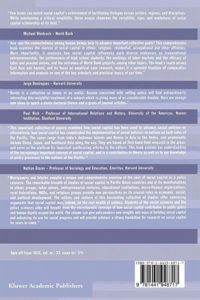 `Few terms can match social capital's achievement of facilitating dialogue across sectors, regions, and disciplines. While maintaining a critical sensibility, these essays showcase the versatility, rigor, and usefulness of social capital scholarship at its best.' Michael Woolcock - World Bank `How may the connectedness among human beings help to advance important collective goals? This comprehensive book examines the sources of social capital in ethnic, religious, residential, occupational and other affinities. More importantly, it assesses how social capital influences such diverse endeavors as transnational entrepreneurship, the performance of high school students, the workings of labor markets and the efficacy of labor and peasant unions, and the outcomes of World Bank projects, among other topics. The book's reach across East Asia and beyond, and its focus on empirical case research, makes it a splendid fountain of comparative information and analysis on one of the key scholarly and practical topics of our time.' Jorge Dominguez - Harvard University `Rarely is a collection as timely or as useful. Anyone concerned with setting policy will find extraordinarily interesting this insightful treatment of a subject which is giving many of us considerable trouble. Here are enough new ideas to spark a dozen doctoral theses and a gross of journal articles.' Paul Rich - Professor of International Relations and History University of the Americas, Fellow, Hoover Institution, Stanford University `This important collection of papers examines how social capital has been used to advance social policies - or alternatively, how social capital has complicated the implementation of social policies &endash; in nations on both sides of the Pacific. The cases range from India's Andaman Islands and Russia in Asia to the Andes, and prominently include China, Japan, and Southeast Asia along the way. They are based on first-hand field research in the areas, and serve as the platform for important synthesizing articles by the editors. This book extends our understanding of the increasingly important concept of social capital, and is a contribution to theory as well as to our knowledge of policy processes in the nations of the Pacific.' Nathan Glazer - Professor of Sociology and Education, Emeritus, Harvard University `Montgomery and Inkeles compile a unique and comprehensive overview of the uses of social capital as a policy resource. The remarkable breadth of studies of social capital in Pacific Basin countries and of its manifestations in ethnic groups, labor unions, entrepreneurial ventures, educational institutions, micro-finance organizations, rural federations, NGOs, and religious groups provide new perspectives on its crucial roles in economic, social, and political development. The editors and authors of this fascinating collection of studies offer convincing arguments that social capital may, indeed, be the real wealth of nations. Students of the social sciences and the policy sciences alike will benefit from the encyclopedic coverage of how social capital contributes to public policy and human dignity around the world. The volume can give policymakers new insights into ways of building social capital and enhancing its use for social progress and will provide scholars a strong foundation for research on social capital for years to come.' Dennis A. Rondinelli - Glaxo Distinguished International Professor of Management, University of North Carolina at Chapel Hill