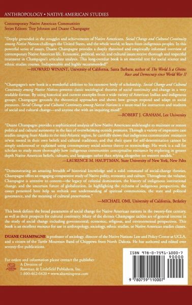Duane Champagne provides a sophisticated analysis on how Native Americans seek/sought to maintain or restore political and cultural autonomy in the face of overwhelming outside pressures pushing them toward individual and collective assimilation. Through a variety of impressive case studies ranging from Alaska to the Mid-Atlantic region, he carefully shows that indigenous communities' resistance is/was rooted in their own beliefs and cultural traditions, and that their quest for self-determination cannot be simply understood or explained using contemporary social science theory or terminology. His excellent work is a call for scholars to study more thoroughly how indigenous communities conceptualize resistance, by exploring in greater depth Native American beliefs, cultures and languages rather than rely altogether on western models. -- Laurence M. Hauptman, SUNY Distinguished Professor of History, SUNY-New Paltz Champagne's new book is a wonderful addition to his extensive body of excellent scholarship. Social Change and Cultural Continuity Among Native Nations presents classic sociological theories of social continuity and change in a very readable format. By using historical and current examples from a wide variety of American Indian and indigenous people groups, Champagne grounds the theoretical approaches and shows how groups respond and adapt to social pressures. Social Change and Cultural Continuity Among Native Nations is a must-read for instructors and students of social and cultural change - and anyone else with an inquiring mind! -- Robert J. Graham, Chair of Behavioral and Social Sciences, Lee University Deeply grounded in the struggles and achievements of Native Americans, Social Change and Cultural Continuity Among Native Nations challenges the United States, and the whole world, to learn from indigenous people. In this powerful series of essays, Duane Champagne provides a deeply theorized and empirically informed overview of contemporary Native American life. Economic, political, social, and cultural issues receive thorough and respectful treatment in Champagne's experienced and articulate analysis. This long-overdue book is an essential text for social science and ethnic studies courses. Indispensable and highly recommended! -- Howard Winant, University of California, Santa Barbara, and author of The World Is a Ghetto: Race and Democracy Since World War II Demonstrating an amazing breadth of historical knowledge and a solid command of social change theories, Champagne offers an engaging comparative study of Native politics, economy, and culture. Throughout the volume, Champagne is attentive to context -- the legacy of colonial domination, the history of indigenous institutional change, and the uncertain future of globalization. In highlighting the richness of indigenous perspectives, the essays presented here help us rethink our understanding of spiritual communities, the state and political governance, and the meaning of cultural preservation. -- Michael Omi, University of California, Berkeley