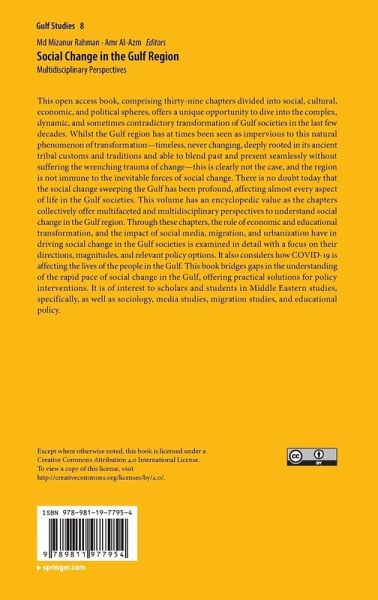 This open access book, comprising thirty-nine chapters divided into social, cultural, economic, and political spheres, offers a unique opportunity to dive into the complex, dynamic, and sometimes contradictory transformation of Gulf societies in the last few decades. Whilst the Gulf region has at times been seen as impervious to this natural phenomenon of transformation-timeless, never changing, deeply rooted in its ancient tribal customs and traditions and able to blend past and present seamlessly without suffering the wrenching trauma of change-this is clearly not the case, and the region is not immune to the inevitable forces of social change. There is no doubt today that the social change sweeping the Gulf has been profound, affecting almost every aspect of life in the Gulf societies. This volume has an encyclopedic value as the chapters collectively offer multifaceted and multidisciplinary perspectives to understand social change inthe Gulf region. Through these chapters, the role of economic and educational transformation, and the impact of social media, migration, and urbanization have in driving social change in the Gulf societies is examined in detail with a focus on their directions, magnitudes, and relevant policy options. It also considers how COVID-19 is affecting the lives of the people in the Gulf. This book bridges gaps in the understanding of the rapid pace of social change in the Gulf, offering practical solutions for policy interventions. It is of interest to scholars and students in Middle Eastern studies, specifically, as well as sociology, media studies, migration studies, and educational policy.