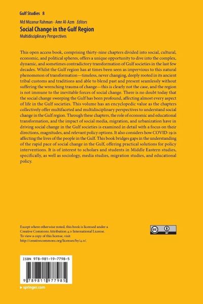 This open access book, comprising thirty-nine chapters divided into social, cultural, economic, and political spheres, offers a unique opportunity to dive into the complex, dynamic, and sometimes contradictory transformation of Gulf societies in the last few decades. Whilst the Gulf region has at times been seen as impervious to this natural phenomenon of transformation-timeless, never changing, deeply rooted in its ancient tribal customs and traditions and able to blend past and present seamlessly without suffering the wrenching trauma of change-this is clearly not the case, and the region is not immune to the inevitable forces of social change. There is no doubt today that the social change sweeping the Gulf has been profound, affecting almost every aspect of life in the Gulf societies. This volume has an encyclopedic value as the chapters collectively offer multifaceted and multidisciplinary perspectives to understand social change inthe Gulf region. Through these chapters, the role of economic and educational transformation, and the impact of social media, migration, and urbanization have in driving social change in the Gulf societies is examined in detail with a focus on their directions, magnitudes, and relevant policy options. It also considers how COVID-19 is affecting the lives of the people in the Gulf. This book bridges gaps in the understanding of the rapid pace of social change in the Gulf, offering practical solutions for policy interventions. It is of interest to scholars and students in Middle Eastern studies, specifically, as well as sociology, media studies, migration studies, and educational policy.