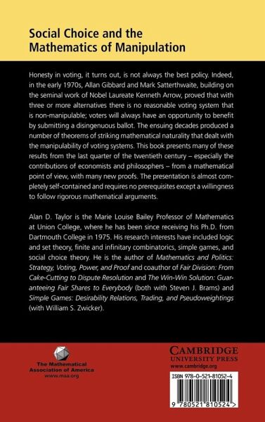 Honesty in voting, it turns out, is not always the best policy. Indeed, in the early 1970s, Allan Gibbard and Mark Satterthwaite, building on the seminal work of Nobel laureate Kenneth Arrow, proved that with three or more alternatives there is no reasonable voting system that is non-manipulable; voters will always have an opportunity to benefit by submitting a disingenuous ballot. The ensuing decades produced a number of theorems of striking mathematical naturality that dealt with the manipulability of voting systems. This 2005 book presents many of these results from the last quarter of the twentieth century, especially the contributions of economists and philosophers, from a mathematical point of view, with many new proofs. The presentation is almost completely self-contained, and requires no prerequisites except a willingness to follow rigorous mathematical arguments. Mathematics students, as well as mathematicians, political scientists, economists and philosophers will learnwhy it is impossible to devise a completely unmanipulable voting system.