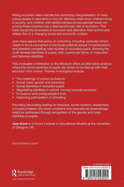 Rising exclusion rates indicate the continuing marginalisation of many young people in education in the UK. Working-class boys, children living in poverty, and children with additional/special educational needs are among those experiencing a disproportionate rate of exclusion. This book traces the processes of exclusion and alienation from school and relates this to a changing social and economic context. Jean Kane argues that policy on schooling, including curricular reform, needs to be re-connected to the broad political pursuit of social justice, and presents compelling case studies of excluded pupils, showing the multi-faceted identities of pupils, with a particular focus on masculine and feminine identities. This invaluable contribution to the literature offers an alternative analysis where the social identities of pupils are shown to be tied up with their exclusion from school. Themes investigated include: the meanings of school exclusions social class, gender and schooling social identities of excluded pupils negotiating identities in school: moving towards exclusion exclusions and young people's lives improving participation in schooling. Providing fascinating reading for teachers, social workers, researchers and policy-makers this book considers how educational disadvantage might be addressed through recognition of the gender and class identities of pupils.