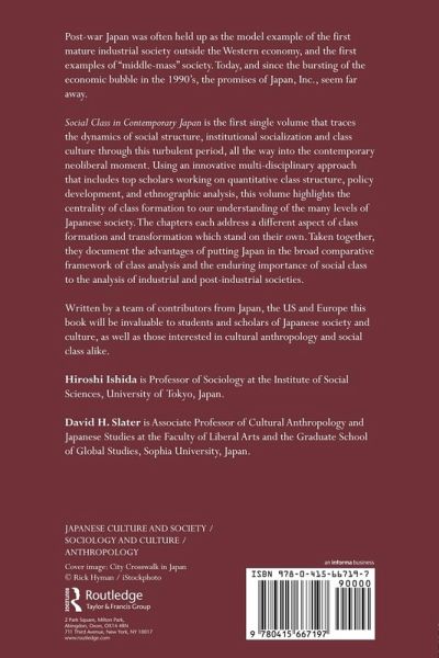 Post-war Japan was often held up as the model example of the first mature industrial societies outside the Western economy, and the first examples of "middle-mass" society. Today, and since the bursting of the economic bubble in the 1990's, the promises of Japan, Inc., seem far away. Social Class in Contemporary Japan is the first single volume that traces the dynamics of social structure, institutional socialization and class culture through this turbulent period, all the way into the contemporary neoliberal moment. In an innovative multi-disciplinary approach that include top scholars working on quantitative class structure, policy development, and ethnographic analysis, this volume highlights the centrality of class formation to our understanding of the many levels of Japanese society. The chapters each address a different aspect of class formation and transformation which stand on their own. Taken together, they document the advantages of putting Japan in the broad comparative framework of class analysis and the enduring importance of social class to the analysis of industrial and post-industrial societies. Written by a team of contributors from Japan, the US and Europe this book will be invaluable to students and scholars of Japanese society and culture, as well as those interested in cultural anthropology and social class alike.