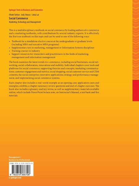 This is a multidisciplinary textbook on social commerce by leading authors of e-commerce and e-marketing textbooks, with contributions by several industry experts. It is effectively the first true textbook on this topic and can be used in one of the following ways: Textbook for a standalone elective course at the undergraduate or graduate levels (including MBA and executive MBA programs)Supplementary text in marketing, management or Information Systems disciplines Training courses in industrySupport resources for researchers and practitioners in the fields of marketing, management and information management The book examines the latest trends in e-commerce, including social businesses, social networking, social collaboration, innovations and mobility. Individual chapters cover tools and platforms for social commerce; supporting theories and concepts; marketing communications; customer engagement and metrics; social shopping; social customer service and CRM contents; thesocial enterprise; innovative applications; strategy and performance management; and implementing social commerce systems.