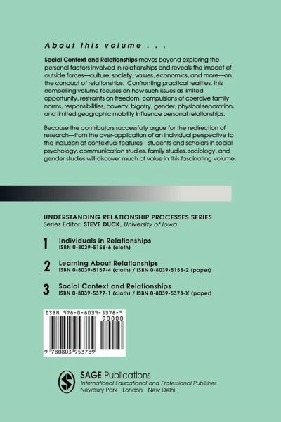 This volume explores the impact of social, cultural, structural, network and dynamic transactional processes on the conduct of relationships. In so doing, it makes a compelling case for research to be directed away from over-application of individual perspectives and towards inclusion of contextual factors. Confronting the practical realities against which individuals may struggle to manage relationships, contributors focus on such issues as: limits on opportunity and freedom; coercive family norms; responsibilities; poverty; and prejudice.