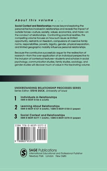 This volume explores the impact of social, cultural, structural, network and dynamic transactional processes on the conduct of relationships. In so doing, it makes a compelling case for research to be directed away from over-application of individual perspectives and towards inclusion of contextual factors. Confronting the practical realities against which individuals may struggle to manage relationships, contributors focus on such issues as: limits on opportunity and freedom; coercive family norms; responsibilities; poverty; and prejudice.