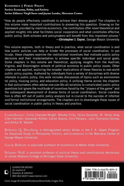 This volume explores how public policy can foster or limit social coordination in the market, civil society, and within various levels of government. Some chapters in this volume are more theoretical, applying public choice and market process theory to public policy issues, while other chapters examine practical, real-world case studies.