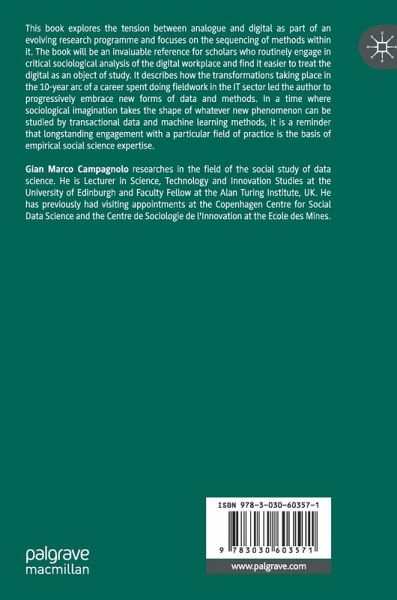 This book explores the tension between analogue and digital as part of an evolving research programme and focuses on the sequencing of methods within it. The book will be an invaluable reference for scholars who routinely engage in critical sociological analysis of the digital workplace and find it easier to treat the digital as an object of study. It describes how the transformations taking place in the 10-year arc of a career spent doing fieldwork in the IT sector led the author to progressively embrace new forms of data and methods. In a time where sociological imagination takes the shape of whatever new phenomenon can be studied by transactional data and machine learning methods, it is a reminder that longstanding engagement with a particular field of practice is the basis of empirical social science expertise.