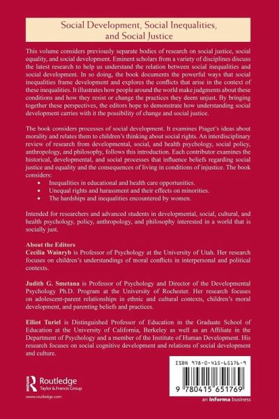 This volume considers previously separate bodies of research on social justice, social equality, and social development. Eminent scholars from a variety of disciplines discuss the latest research to help us understand the relation between social inequalities and social development. In so doing, the book documents the powerful ways that social inequalities frame development and explores the conflicts that arise in the context of these inequalities. It illustrates how people around the world make judgments about these conditions and how they resist or change the practices they deem unjust. By bringing together these perspectives, the editors hope to demonstrate how understanding social development carries with it the possibility of change and social justice. The book considers processes of social development. It examines Piaget's ideas about morality and relates them to children's thinking about social rights. An interdisciplinary review of research from developmental, social, and health psychology, social policy, anthropology, and philosophy, follows this introduction. Each contributor examines the historical, developmental, and social processes that influence beliefs regarding social justice and equality and the consequences of living in conditions of injustice. The book considers: Inequalities in educational and health care opportunities. Unequal rights and harassment and their effects on minorities. The hardships and inequalities encountered by women. Intended for researchers and advanced students in developmental, social, cultural, and health psychology, policy, anthropology, and philosophy interested in a world that is socially just.