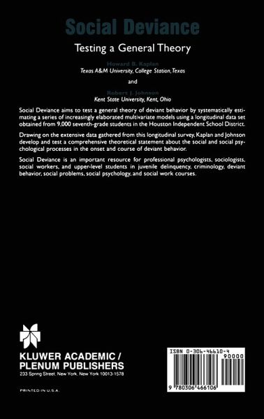Inthisvolumewereportaseriesofanalysesofpaneldatadesignedtotestaspects ofacomprehensivetheoreticalstatementaboutthesocialandsocial-psychological processesthatplayapartintheonsetandcourse(includingcessationandcontinu ationatincreased,decreased,orconstantlevels)ofdeviantbehavior. InPartIwe outlineourtheoreticalandmethodologicalapproachtothestudyofdeviantbehav ior. ChapterIpresentsacomprehensivetheoreticalstatementthathasevolvedover aperiodofmorethantwodecades(Kaplan,1972,1975b,1980,1982,1983,1984, 1986,1995,1996)outofaconsiderationofthetheoreticalandempiricalreports ofothersandinresponsetoourownearliertestsofthegeneraltheory(Kaplan & Damphousse,1997;Kaplan&Fukurai,1992;Kaplan&Johnson,1991;Kaplan, Johnson, &Bailey,1986,1987,1988;Kaplan,Martin, &Johnson,1986;Kaplan & Peck,1992). Thestatementisorganizedasaresponsetofourinterrelatedquestions: Whatsocialandsocial-psychologicalfactors(1)influencethesocialdefinitionof deviantbehavior;(2)motivateindividualstoperformdeviantbehaviors;(3)facili tatetheperformanceofdeviantbehaviorindependentlyoforininteractionwithfac torsthatinfluencemotivationtoengageindeviantbehavior;and(4)influencethe stabilityofdeviantbehavior,independentlyoforininteractionwithfactorsthat influencetheinitiationofdeviantbehavior?Thisstatementprovidesaframework andrationaleforthemultivariatemodelsweestimateandreportinlaterpartsofthe volume. Chapter2providesdetailsofthepaneldesignandmultivariateanalytic techniques. Thesample,arandomhalfofthe1971cohortofseventhgradersina largeurbanschooldistrict,wastesteduptofourtimesbetweenearlyadolescence andyoungadulthood. Thetheoreticallyinformedmultivariatemodelsaretested usingtheLISRELVIprogram(Joreskog &Sorbom,1986)toestimatethestruc turalrelationshipsamonglatentvariables. InPartIIweestimateseveralmodelsthataccountforvariationindeviant behaviormeasuredintheninthgradeintermsofconstructsmeasuredinthesev enthandeighthgrades. InChapter3weestimate,forallsubjectswhoprovideddata duringtheseventh,eighth,andninthgradetestings,aseriesoffourincreasingly elaboratedmodelsinwhichanewvariableisaddedtotheimmediatelypreceding modelasplayingcommonantecedentand/orinterveningexplanatoryroles. The vii viii Preface mostinclusivemodelhasbeenpublishedpreviouslyinitspresentform(Kaplan & Johnson,1991);thethreelessinclusivemodelshaveappearedinsomewhatdiffer entform(Johnson &Kaplan,1987;Kaplan,Johnson, &Bailey,1986,1987;Kaplan, Martin, &Johnson,1986). Thepresentversionsdifferfromtheearlierversionsin termsofexogenousvariables,measurementvariables,samplesize,andinclusionof correlateddisturbancesinthemodels. Therepetitionofthemostinclusivemodel andthereestimationoftheotherthreemodelspermitustodescribeandeasilycom municatetheeffectsofeachsuccessivetheoreticalelaborationandtodiscussthe resultsingreaterdetailthanpublicationintheperiodicalliteraturegenerallyper mits. Thereproductionofthemostinclusivemodelalsoprovidesabaseagainst whichwecancomparethemodelsestimatedinthenexttwochapters. InChapters 4and5,respectively,weestimatethismodelforsubgroupsinordertotestassump tionsabouttheequivalenceofmeasurementmodelsandstructuralinvariance betweenthedifferentsocialgroupings. InChapter4weestimatethemodelfor malesandfemales. InChapter5weestimatethemostinclusiveexplanatorymodel forsubgroupsdifferentiatedaccordingtorace/ethnicity. InPartIIIwereportanalysesthataddressthevalidityofthemodelasan explanationofdeviantbehaviorthatismeasuredandexpressedinyoungadult hood. InChapter6theelaboratedmodelasanexplanationofdeviantbehaviorin youngadulthoodisestimatedforthemostinclusivegroupingavailable,white malesandfemalesconsideredtogether. Whenwewereattemptingtoconductsub groupanalysisforgroupsdifferentiatedaccordingtorace/ethnicity,itbecame apparentthat-unlikethesituationinpredictingdeviantbehaviorinearlyadoles cence-themeasuresofdeviantbehaviorusedfortheyoungadultanalyses formedavalidconstructonlyforthewhitesubjects. Themeasuresoftheconstruct werenotsufficientlyvalidorreliabletopermitestimationinasampleofyoung blackadults. Further,forHispan