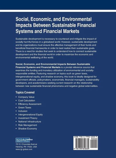 Sustainable development is necessary to counteract and mitigate the impact of socially harmful forces in a globalized world. However, sustainable development and its organizations must ensure the effective management of their funds and beneficial financial frameworks in order to best realize their sustainable goals. There is a need for studies that seek to understand how to connect sustainable development and the financial world in order to maximize the economic and environmental wellbeing of the world. Social, Economic, and Environmental Impacts Between Sustainable Financial Systems and Financial Markets is a pivotal reference source that examines the funding and monetary utilization of environmental and socially-responsible entities. Featuring research on topics such as green taxes, intergenerational equity, and shadow economy, this book is ideally designed for government officials, policymakers, economists, financial managers, sustainability developers, and academicians seeking current research on the relationship between new sustainable financial phenomena and negative global externalities.