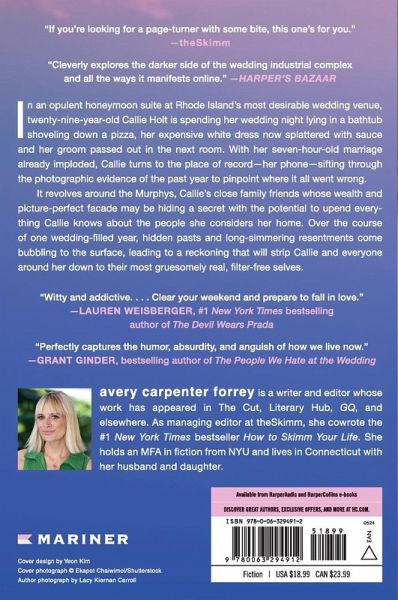 "If you’re looking for a page-turner with some bite, this one’s for you." —theSkimm "Millennial wedding culture gets a much-needed skewering in this alternately light and biting novel." — Vogue A razor-sharp and darkly humorous debut novel exploring millennial wedding culture, class, and relationships, all filtered through the ever-present lens of social media. In an opulent honeymoon suite in Watch Hill, Rhode Island’s most desirable wedding venue, 29-year-old Callie Holt is spending her wedding night lying in a bathtub shoveling down a pizza; her expensive white dress now splattered with sauce and her groom passed out in the next room. With her seven-hour-old marriage already imploded, Callie turns to the place of record – her phone – sifting through the photographic evidence of the past year to pinpoint where it all went wrong. Could it have started when Callie moved in with her best friend, Virginia Murphy, in the swanky Upper East Side pied-à-terre for which Virginia’s parents foot the bill? Or when Virginia’s irritatingly attractive cousin (and Callie’s secret ex) Ollie returned from pursuing his photography career abroad, throwing a wrench in Callie’s relationship with her kind (if a bit dim) finance bro boyfriend, Whit? Or was the true turning point when Callie stumbled upon a dark secret lurking in the Murphys’ well-heeled past, one with the potential to upend everything Callie knows about the people she considers her second family? Over the course of one wedding-filled year, all these long-simmering secrets and resentments will come bubbling to the surface, leading to a reckoning that will strip Callie and everyone around her down to their most gruesomely real, filter-free selves. As Callie attends wedding after wedding, getting tagged in post after post, she begins to contemplate—and actualize through her own art—the gulf between the true selves of the people around her and the selves they present on their screens.