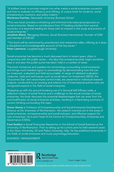 Social enterprise has become a much discussed term in recent years, often in conjunction with the public sector - the idea that entrepreneurship might somehow step in and save the public purse has taken hold in a number of areas. This book introduces and explains the terminology surrounding social enterprise and brings much-needed rigour to proceedings by demonstrating how this can be measured, evaluated and held accountable. A range of validated evaluation measures, tools and techniques, such as 'SROI', the 'Outcomes Star' and randomised control trials, are presented in individual research projects, conducted by an exciting and eclectic mix of international authors who are recognised experts in the field of social enterprise. Wrapping up with the ground-breaking use of a General Self-Efficacy scale, a reflective critique of social finance and a challenge to the actual concept of social enterprise, the book discusses the potential disadvantages that can arise from the commodification of social enterprise activities, resulting in a fascinating summary of current thinking surrounding this topic.