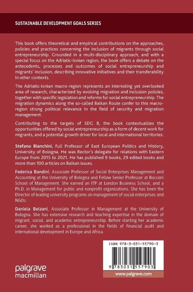 This book offers theoretical and empirical contributions on the approaches, policies, practices concerning the inclusion of migrants through social entrepreneurship. Grounded in a multi-disciplinary approach and with a special focus on the Adriatic-Ionian region, the book offers a debate on the antecedents, processes and outcomes of social entrepreneurship and migrants' inclusion, describing some innovative initiatives and their potential transferability in other contexts.