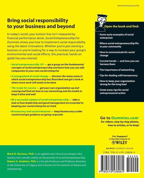 Learn to: * Start and run a socially conscious enterprise * Use today's most progressive business tools * Incorporate socially responsible concepts into your business plan * Implement ideas and processes Bring social responsibility to your business and beyond In today's world, your bottom line isn't measured by financial performance alone. Social Entrepreneurship For Dummies shows you how to implement social responsibility using the latest innovations. Whether you're just starting a business or you're looking for a way to increase your group's environmental and social effects, this practical, hands-on guide has you covered. * Social entrepreneurship 101 -- get a grasp on the fundamental concepts of social entrepreneurship and learn how you can add compassion to your own social enterprise * A smorgasbord of social change -- discover the many areas in which social entrepreneurship has flourished and get a look at where more work still needs to be done * The recipe for success -- get your own organization up and running and find out how to use networking and the media to keep it alive and well * Be a successful captain of social entrepreneurship -- take a look at how leadership and good management are essential to keeping your social enterprise on track * Bureaucracy and social enterprise -- keep bureaucracy under control and get guidance on going corporate Open the book and find: * Some early examples of social enterprises * Where social entrepreneurship fits in your community * How to communicate for social change * Current trends -- and how you can harness them * The importance of networking * Tips for dealing with bureaucracy * How to keep your organization strong for the long haul * Great areas ripe for social entrepreneurial action