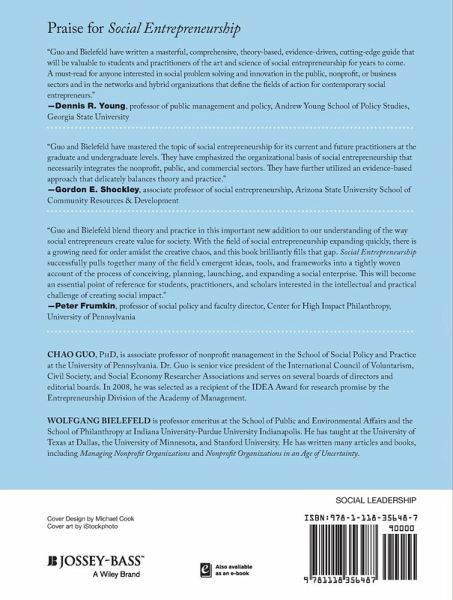 Praise for Social Entrepreneurship "Guo and Bielefeld have written a masterful, comprehensive, theory-based, evidence-driven, cutting-edge guide that will be valuable to students and practitioners of the art and science of social entrepreneurship for years to come. A must-read for anyone interested in social problem solving and innovation in the public, nonprofit, or business sectors and in the networks and hybrid organizations that define the fields of action for contemporary social entrepreneurs." --Dennis R. Young, professor of public management and policy, Andrew Young School of Policy Studies, Georgia State University "Guo and Bielefeld have mastered the topic of social entrepreneurship for its current and future practitioners at the graduate and undergraduate levels. They have emphasized the organizational basis of social entrepreneurship that necessarily integrates the nonprofit, public, and commercial sectors. They have further utilized an evidence-based approach that delicately balances theory and practice." --Gordon E. Shockley, associate professor of social entrepreneurship, Arizona State University School of Community Resources & Development "Guo and Bielefeld blend theory and practice in this important new addition to our understanding of the way social entrepreneurs create value for society. With the field of social entrepreneurship expanding quickly, there is a growing need for order amidst the creative chaos, and this book brilliantly fills that gap. Social Entrepreneurship successfully pulls together many of the field's emergent ideas, tools, and frameworks into a tightly woven account of the process of conceiving, planning, launching, and expanding a social enterprise. This will become an essential point of reference for students, practitioners, and scholars interested in the intellectual and practical challenge of creating social impact." --Peter Frumkin, professor of social policy and faculty director, Center for High Impact Philanthropy, University of Pennsylvania