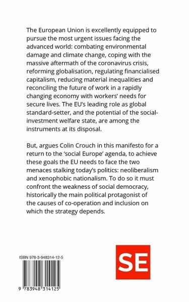 The European Union is excellently equipped to pursue the most urgent issues facing the advanced world: combating environmental damage and climate change, coping with the massive aftermath of the coronavirus crisis, reforming globalisation, regulating financialised capitalism, reducing material inequalities and reconciling the future of work in a rapidly changing economy with workers' needs for secure lives. The EU's leading role as global standard-setter, and the potential of the social-investment welfare state, are among the instruments at its disposal. But, argues Colin Crouch in this manifesto for a return to the 'social Europe' agenda, to achieve these goals the EU needs to face the two menaces stalking today's politics: neoliberalism and xenophobic nationalism. To do so it must confront the weakness of social democracy, historically the main political protagonist of the causes of co-operation and inclusion on which the strategy depends.