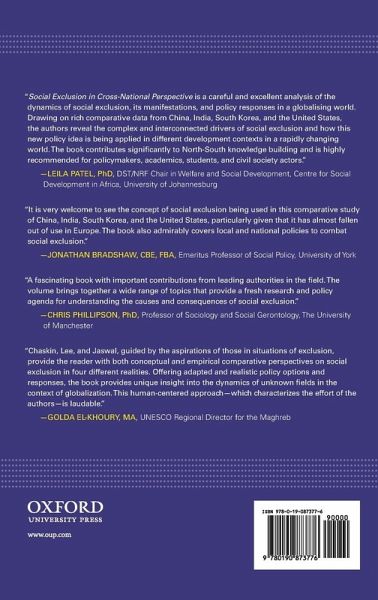 * Chapter 1. Social Exclusion in Cross-National Perspective: Setting the Stage * Robert J. Chaskin Joan Yoo Surinder Jaswal Shengli Chen * Part One. Mapping Social Exclusion: Concepts and Contexts * Chapter 2. Globalization and Social Exclusion: Concepts and Processes * Robert J. Chaskin Jung-Hwa Ha Mouleshri Vyas * Chapter 3. Social Exclusion as a Policy Idea: Dissemination Adaptation and Application * Colleen Grogan Surinder Jaswal Gao Xiang Joan Yoo * Part Two. Social Exclusion on the Ground: Dimensions Populations and Impact * Chapter 4. Urban Restructuring Housing Policy and Social Exclusion * Robert J. Chaskin Mouleshri Vyas Bong Joo Lee Shengli Chen * Chapter 5. Migration and Changing Social Ecosystems * Xiang Gao Virginia Parks Mouleshri Vyas Hyemee Kim * Chapter 6. The Transition to Adulthood for Marginalized Youth * Mark E. Courtney Suo Deng Anjali Dave Vijay Raghavan Bong Joo Lee * Chapter 7. Social Exclusion and Older Adults * Jung-Hwa Ha Deborah Carr Subharati Ghosh Hyeon Jung Lee * Part Three. Shaping and Responding to Social Exclusion: The State NGOs and Community Action * Chapter 8. Changing Roles and Relationships between NGOs and the State in Shaping * and Responding to Social Exclusion * Jennifer Mosley Ethan Park Suo Deng Monica Sakhrani * Chapter 9. Democratic Engagement and Mobilization: The Role of Grassroots * Movements * Mouleshri Vyas Jennifer Mosley Colleen Grogan Yan Long Hyoung * Yong Kim Robert J. Chaskin * Chapter 10. Health Policy and Social Exclusion * Colleen Grogan Surinder Jaswal Jung Min Park * Chapter 11. The Impact of Globalization and Social Exclusion on Education and Child Development * Suo Deng Shewli Kumar Joan Yoo Camille A. Farrington * Chapter 12. State Responses and Structures for Child Protection * Bong Joo Lee Mark E. Courtney Xiang Gao Monica Sakrani * Chapter 13. Social Exclusion in a Globalized World: Implications for Research Policy * and Practice * Robert J. Chaskin Surinder Jaswal Bong Joo Lee