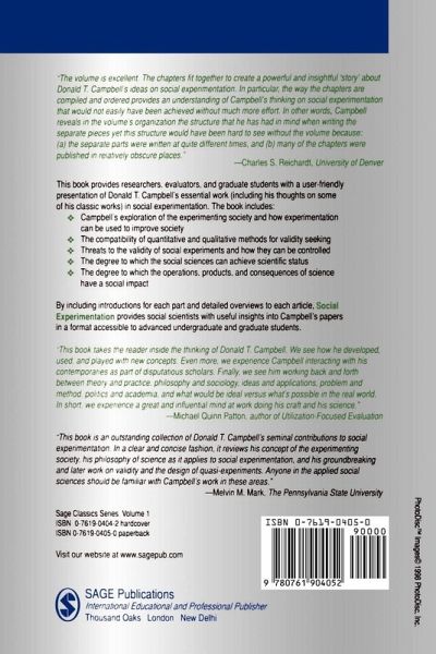 Social Experimentation offers a user-friendly presentation of Donald Campbell's essential work in social experimentation. It includes exploration of the experimenting society; the compatibility of quantitative and qualitative methods of validity seeking; threats to the validity of social experiments and how they can be controlled; the degree to which the social sciences can achieve scientific status; and the degree to which the operations, products and consequences of science have a social impact.