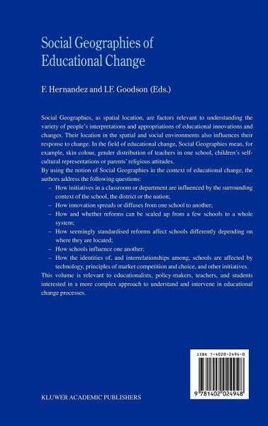 Social Geographies, as spatial location, is a factor relevant to understanding the variety of people's interpretations and appropriations of educational innovations and changes. Their location in the social space also influences their response to change. In the field of educational change, social space means for example, skin colour, gender distribution of teachers in one school, children's self-cultural representations or parents' religious attitudes.