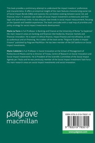 This book provides a preliminary attempt to understand the impact investors' preferences and characteristics. It offers an empirical insight of the main features characterizing social risk of Social Impact Bonds (SIBs) and explores the correlation existing between social risk and financial return. It assesses case studies of social impact investment architectures and their legal and operational limits. It also analyzes new trends in social impact measurement, focusing on the Spanish and Swedish experiences. The book concludes with a road map of priorities and policy strategy for social impact investments development.