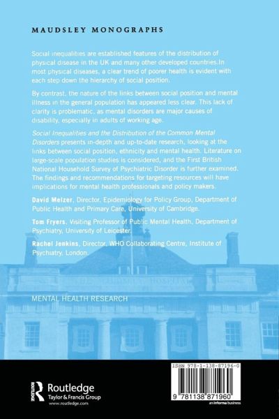 Social inequalities are established features of the distribution of physical disease in the UK and many other developed countries. In most physical diseases, a clear trend of poorer health is evident with each step down the hierarchy of social position. By contrast, the nature of the links between social position and mental illness in the general population has appeared less clear. This lack of clarity is problematic, as mental disorders are major causes of disability, especially in adults of working age. Social Inequalities and the Distribution of the Common Mental Disorders presents in-depth and up-to-date research, looking at the links between social position, ethnicity and mental health. Its findings will have implications for mental health professionals and policy makers.