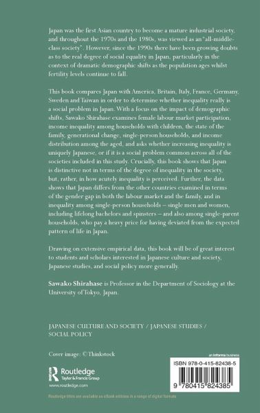 Japan was the first Asian country to become a mature industrial society, and throughout the 1970s and the 1980s, was viewed as an 'all-middle-class society'. However since the 1990s there have been growing doubts as to the real degree of social equality in Japan, particularly in the context of dramatic demographic shifts as the population ages whilst fertility levels continue to fall. This book compares Japan with America, Britain, Italy, France, Germany, Sweden and Taiwan in order to determine whether inequality really is a social problem in Japan. With a focus on impact demographic shifts, Sawako Shirahase examines female labour market participation, income inequality among households with children, the state of the family, generational change, single person households and income distribution among the aged, and asks whether increasing inequality and is uniquely Japanese, or if it is a social problem common across all of the societies included in this study. Crucially, this book shows that Japan is distinctive not in terms of the degree of inequality in the society, but rather, in how acutely inequality is perceived. Further, the data shows that Japan differs from the other countries examined in terms of the gender gap in both the labour market and the family, and in inequality among single-person households - single men and women, including lifelong bachelors and spinsters - and also among single parent households, who pay a heavy price for having deviated from the expected pattern of life in Japan. Drawing on extensive empirical data, this book will be of great interest to students and scholars interested in Japanese culture and society, Japanese studies and social policy more generally.