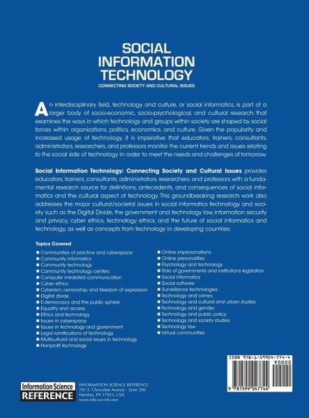 An interdisciplinary field, technology and culture, or social informatics, is part of a larger body of socio-economic, socio-psychological, and cultural research that examines the ways in which technology and groups within society are shaped by social forces within organizations, politics, economics, and culture. Given the popularity and increased usage of technology, it is imperative that educators, trainers, consultants, administrators, researchers, and professors monitor the current trends and issues relating to social side of technology in order to meet the needs and challenges of tomorrow. Social Information Technology: Connecting Society and Cultural Issues provides educators, trainers, consultants, administrators, researchers, and professors with a fundamental research source for definitions, antecedents, and consequences of social informatics and the cultural aspect of technology. This groundbreaking research work also addresses the major cultural/societal issues in social informatics technology and society such as the Digital Divide, the government and technology law, information security and privacy, cyber ethics, technology ethics, and the future of social informatics and technology, as well as concepts from technology in developing countries.