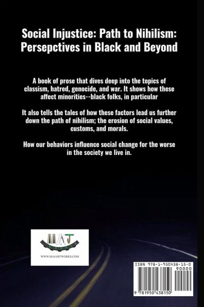 Social Injustice: Path to Nihilism: Perspectives in Black and Beyond : is A book of prose that dives deep into the topics of classism, hatred, genocide, and war. It shows how these affect minorities--black folks, in particular It also tells the tales of how these factors lead us further down the path of nihilism; the erosion of social values, customs, and morals. How our behaviors influence social change for the worse in the society we live in.