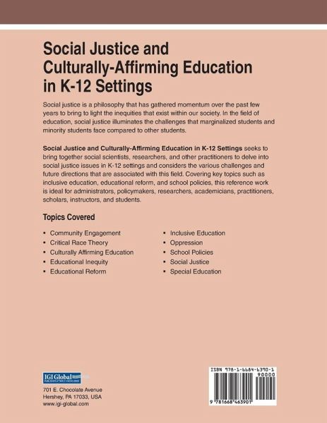 Social justice is a philosophy that has gathered momentum over the past few years to bring to light the inequities that exist within our society. In the field of education, social justice illuminates the challenges that marginalized students and minority students face compared to other students. Social Justice and Culturally-Affirming Education in K-12 Settings seeks to bring together social scientists, researchers, and other practitioners to delve into social justice issues in K-12 settings and considers the various challenges and future directions that are associated with this field. Covering key topics such as inclusive education, educational reform, and school policies, this reference work is ideal for administrators, policymakers, researchers, academicians, practitioners, scholars, instructors, and students.