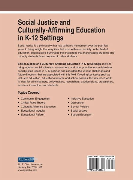 Social justice is a philosophy that has gathered momentum over the past few years to bring to light the inequities that exist within our society. In the field of education, social justice illuminates the challenges that marginalized students and minority students face compared to other students. Social Justice and Culturally-Affirming Education in K-12 Settings seeks to bring together social scientists, researchers, and other practitioners to delve into social justice issues in K-12 settings and considers the various challenges and future directions that are associated with this field. Covering key topics such as inclusive education, educational reform, and school policies, this reference work is ideal for administrators, policymakers, researchers, academicians, practitioners, scholars, instructors, and students.
