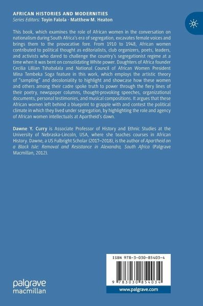 This book, which examines the role of African women in the conversation on nationalism during South Africa's era of segregation, excavates female voices and brings them to the provocative fore. From 1910 to 1948, African women contributed to political thought as editorialists, club organizers, poets, leaders, and activists who dared to challenge the country's segregationist regime at a time when it was bent on consolidating White power. Daughters of Africa founder Cecilia Lillian Tshabalala and National Council of African Women President Mina Tembeka Soga feature in this work, which employs the artistic theory of "sampling" and decoloniality to highlight and showcase how these women and others among their cadre spoke truth to power through the fiery lines of their poetry, newspaper columns, thought-provoking speeches, organizational documents, personal testimonies, and musical compositions. It argues that these African women left behind a blueprint to grapple with and contestthe political climate in which they lived under segregation, by highlighting the role and agency of African women intellectuals at Apartheid's dawn.