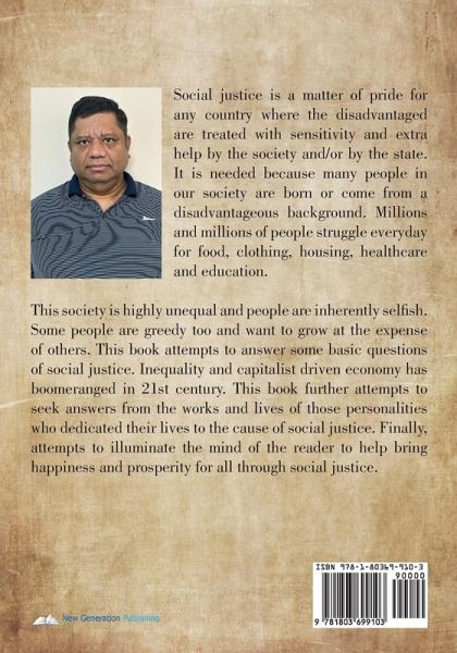 Social justice is a matter of pride for any country where the disadvantaged are treated with sensitivity and extra help by the society and/or by the state. It is needed because many people in our society are born or come from a disadvantageous background. Millions and millions of people struggle everyday for food, clothing, housing, healthcare and education. This society is highly unequal and people are inherently selfish. Some people are greedy too and want to grow at the expense of others. This book attempts to answer some basic questions of social justice. Inequality and capitalist driven economy has boomeranged in 21st century. This book further attempts to seek answers from the works and lives of those personalities who dedicated their lives to the cause of social justice. Finally, attempts to illuminate the mind of the reader to help bring happiness and prosperity for all through social justice.