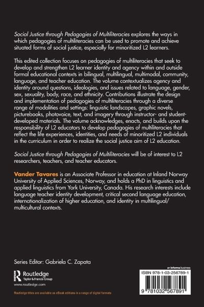 "Through skilful editing, Vander Tavares has identified a range of innovative scholars whose research brings both breadth and depth to the exciting area of multiliteracies. From different regions of the world, and with diverse disciplinary interests, what the contributors have in common is a passion for equity, diversity, and inclusion in language and literacy education. Teachers and researchers who wish to help multilingual learners reframe and reclaim identities of power will find inspiration from Social Justice through Pedagogies of Multiliteracies."