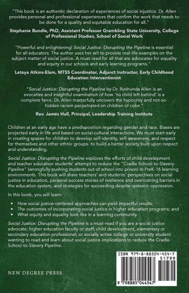 Children at an early age have a predisposition regarding gender and race. Biases are projected early in life and based on social-cultural interactions. We must start early in creating spaces for children to develop self-identity, self-awareness, and respect for themselves and other ethnic groups- to build a better society built upon respect and understanding. Social Justice: Disrupting the Pipeline explores the efforts of child development and teacher education students' attempt to reduce the "Cradle-School-to-Slavery Pipeline" (wrongfully pushing students out of school into prison) in PreK-16 learning environments. This book will share teachers' and students' perspectives on social justice in education, personal success stories of resilience and overcoming barriers in the education system, and strategies for succeeding despite systemic oppression. In this book, you will learn:How social justice-centered approaches can yield impactful results; The outcomes of incorporating social justice in higher education programs; and What equity and equality look like in a learning community. ¿ Social Justice: Disrupting the Pipeline is a must-read if you are a social justice advocate; higher education faculty or staff; child development, elementary or secondary education professional; or socially active college or university student wanting to read and learn about social justice implications to reduce the Cradle-School-to-Slavery Pipeline.